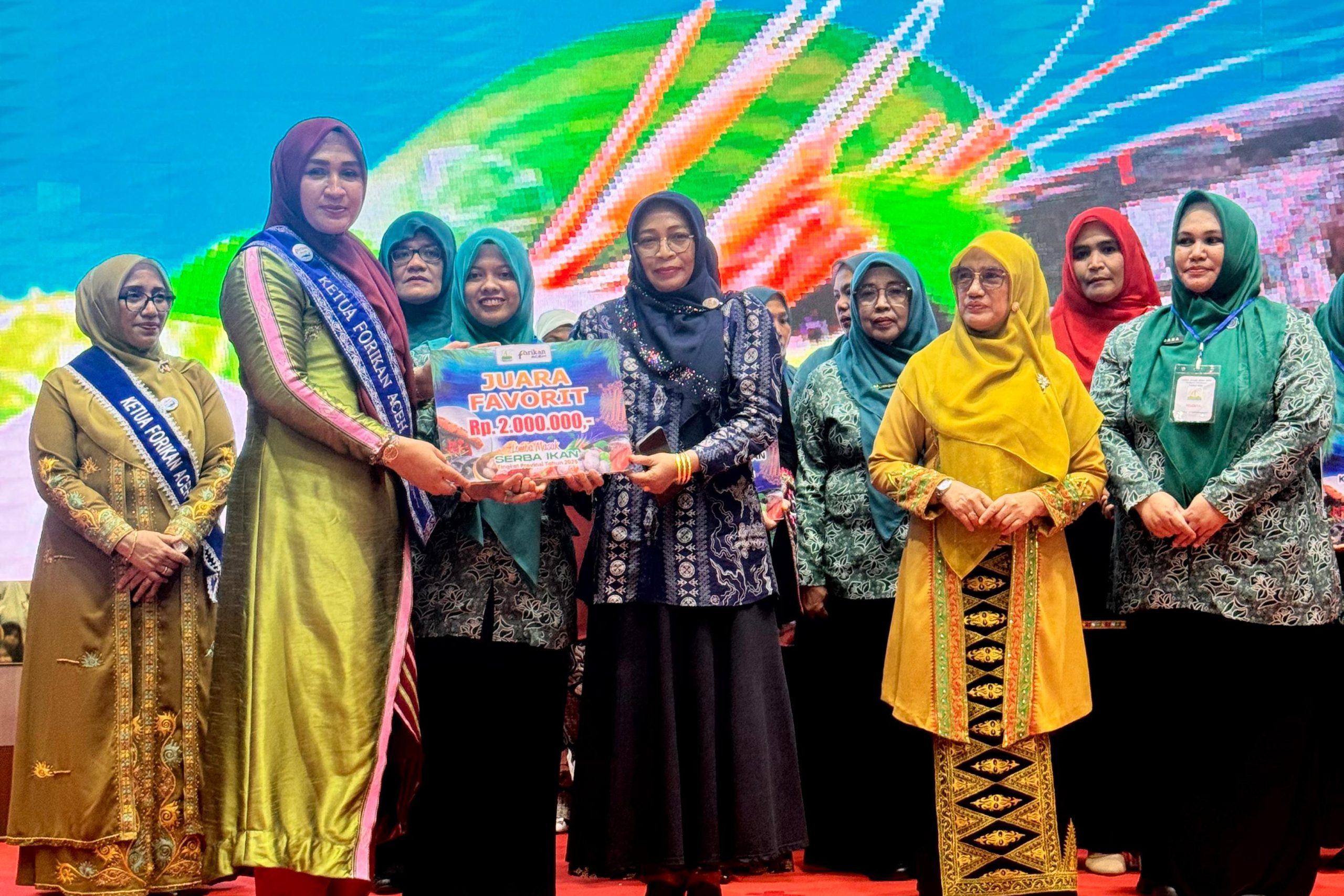 Peserta dari Kabupaten Aceh Besar berhasil keluar sebagai Juara Umum pada Lomba Masak Serba Ikan yang diselenggarakan Forum Peningkatan Konsumsi Ikan (Forikan) Aceh di Anjong Mon Mata Banda Aceh Jum’at (7/11/2025).