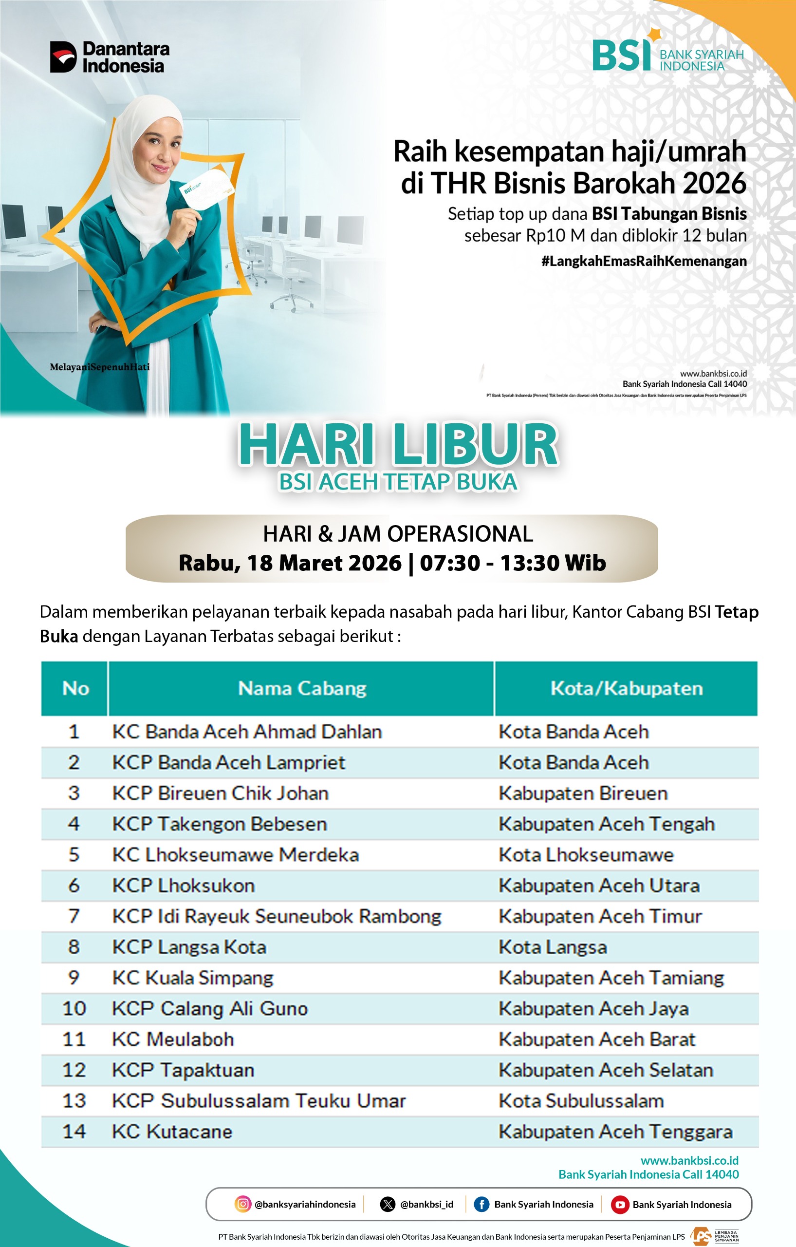 Dalam rangka memberikan pelayanan optimal kepada masyarakat pada momen libur panjang Idul Fitri 1447 H, Bank Syariah Indonesia (BSI) Regional Aceh memastikan tetap membuka layanan operasional terbatas di sejumlah outlet.