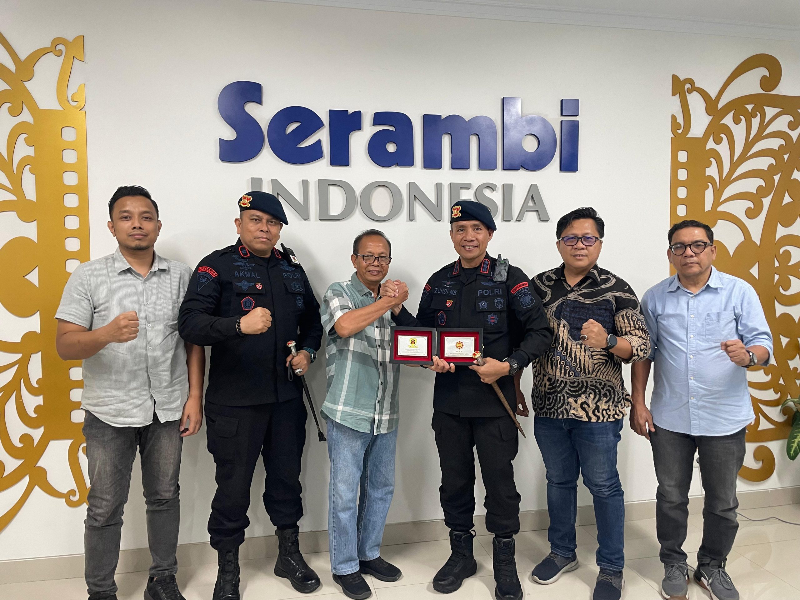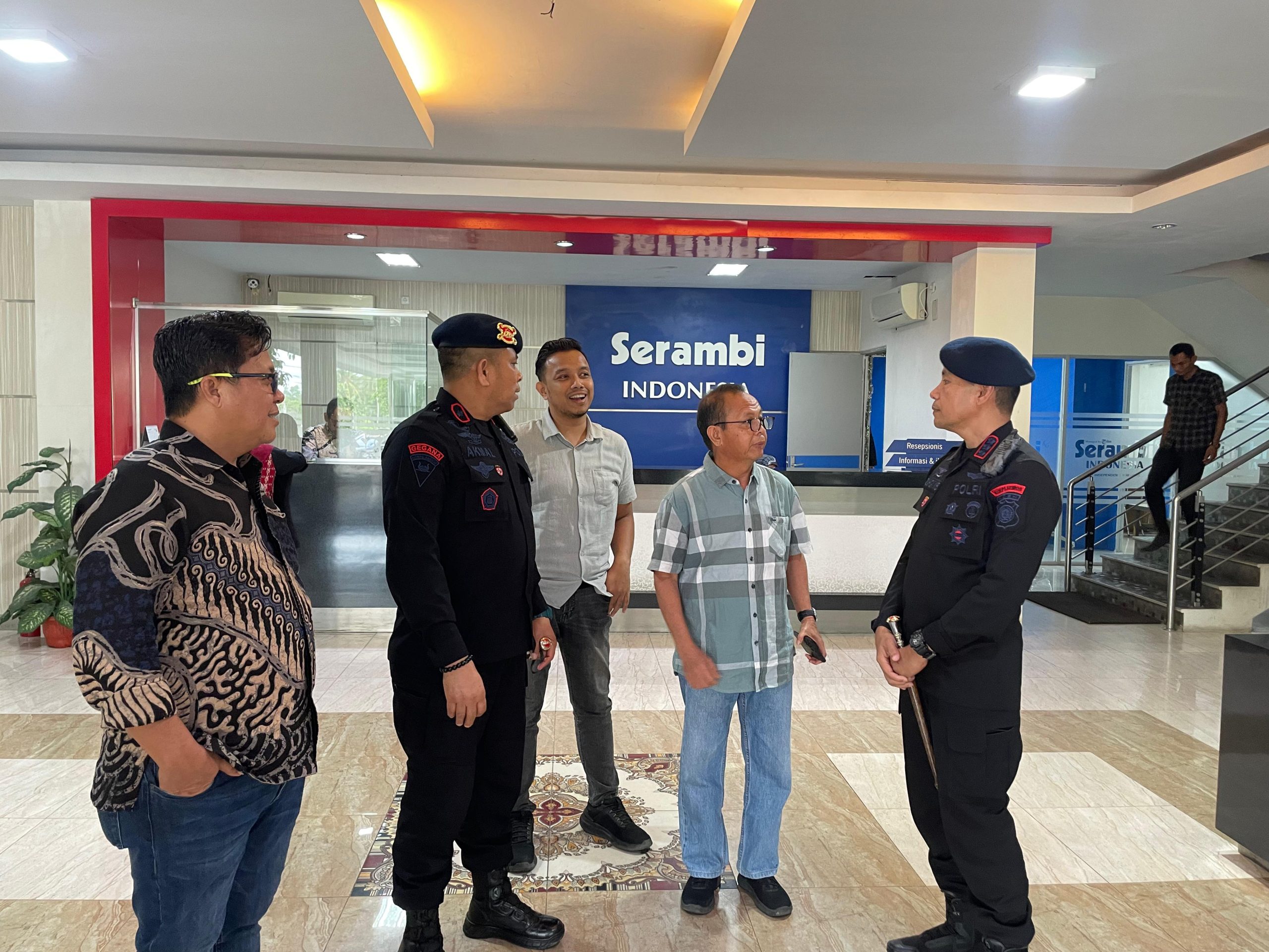 Rombongan Brimob Polda Aceh disambut oleh General Manager (GM) Bisnis Serambi Indonesia Mohd Din bersama para staf Serambi lainnya.