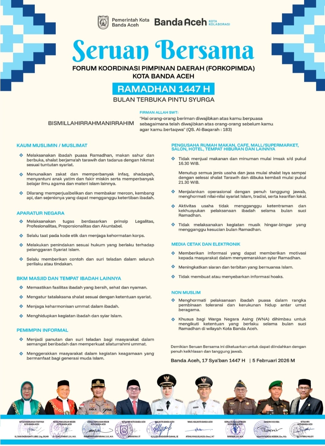 Forum Komunikasi Pimpinan Daerah (Forkopimda) Kota Banda Aceh meminta para pemilik usaha rumah makan, Café, Mall/super market, Salon, Hotel, tempat hiburan dan lainnya untuk menjaga keamanan, Ketertiban dan kenyamanan bagi umat muslim yang sedang melaksnakan puasa selama Bulan suci Ramadhan 1447 H.