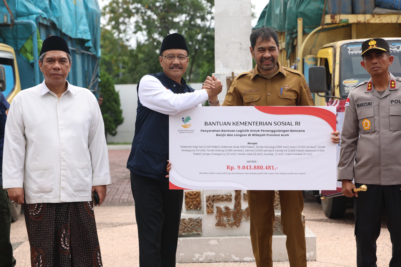 Gubernur Aceh H Muzakir Manaf menerima bantuan logistik penanganan bencana dari Kementerian Sosial Republik Indonesia senilai Rp 9 miliar itu diserahkan langsung Menteri Sosial Saifullah Yusuf di Kantor Gubernur Aceh Selasa (16/12/2025).