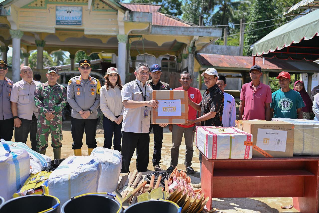 Kapolres Pidie AKBP Jaka Mulyana, SIK, MIK, mendampingi Tim Kantor Staf Presiden (KSP) Republik Indonesia yang dipimpin oleh Ancilla Yanny Irmella dalam penyerahan bantuan kepada masyarakat terdampak bencana alam banjir di Kabupaten Pidie Sabtu (3/1/2026).