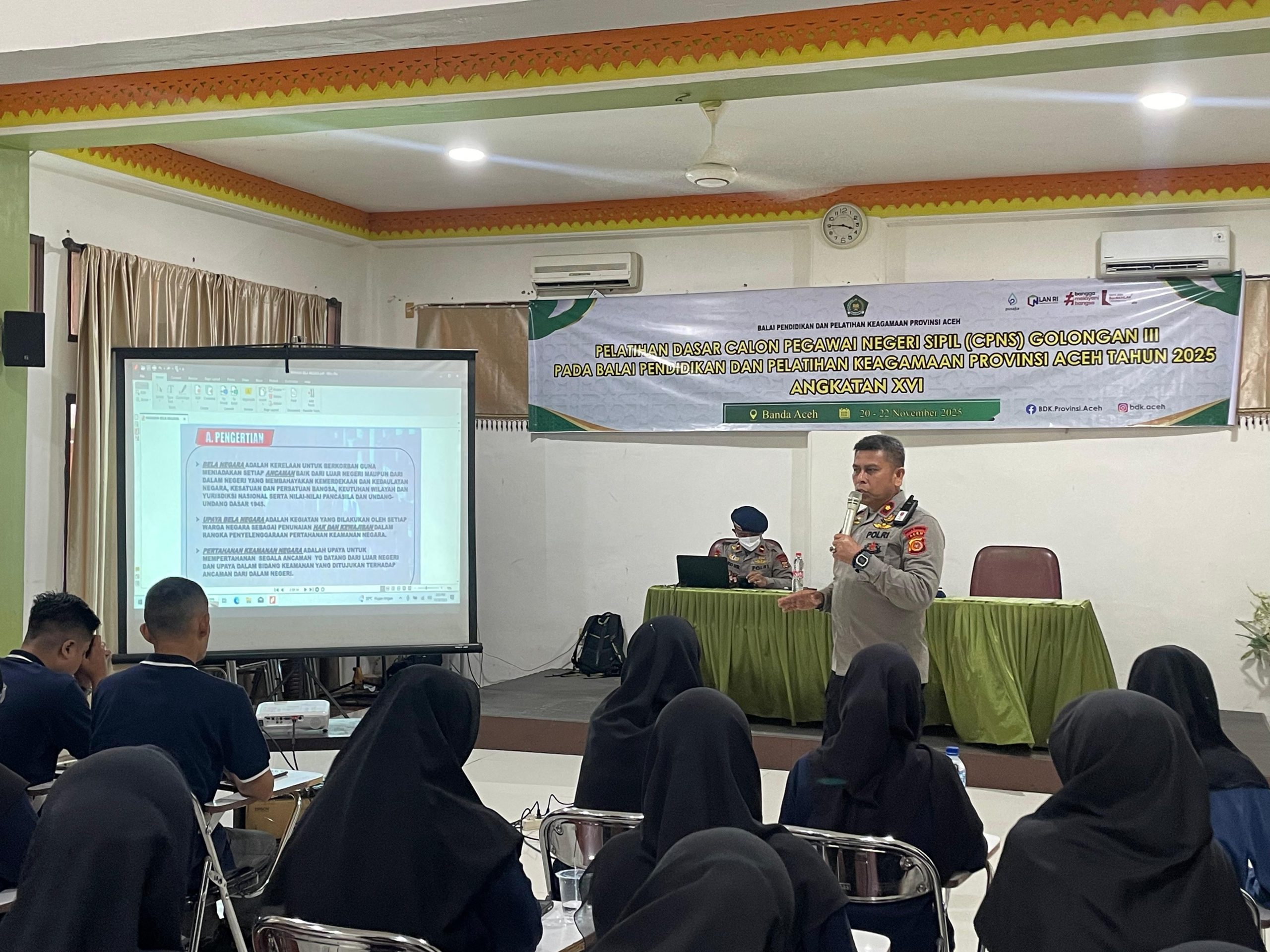 Komandan Satuan Brimob Polda Aceh Kombes Pol Zuhdi Batubara, S.I.K., M.Han dengan menugaskan Komandan Detasemen Gegana Satbrimob Polda Aceh Kompol Akmal, S.E., M.M untuk memberikan pembekalan materi Aksi Bela Negara dan Wawasan Nusantara kepada peserta Diklat Prajabatan.