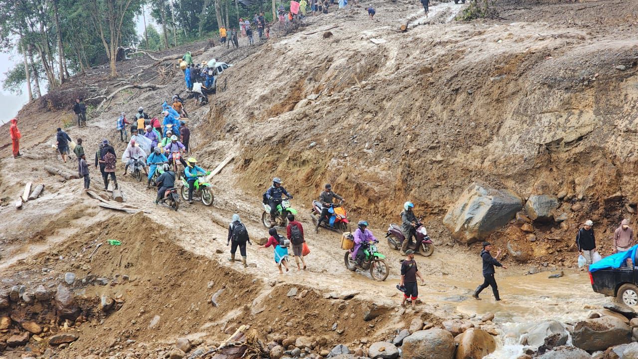 Medan longsor yang sangat sulit dan berat membuat kendaraan roda empat tidak mampu melintas. Tim kemudian beralih menggunakan motor trail dan hanya bisa mencapai Jembatan Tengge Besi.