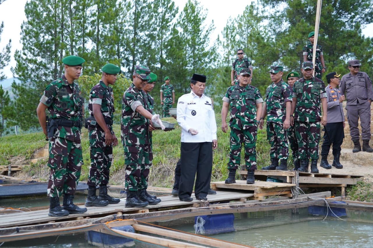 Kemudian Pangdam meninjau program ketahanan pangan Yonif TP 855/RD meliputi lahan pertanian siap tanam, peternakan kambing dan sapi, serta kolam ikan berbagai jenis.