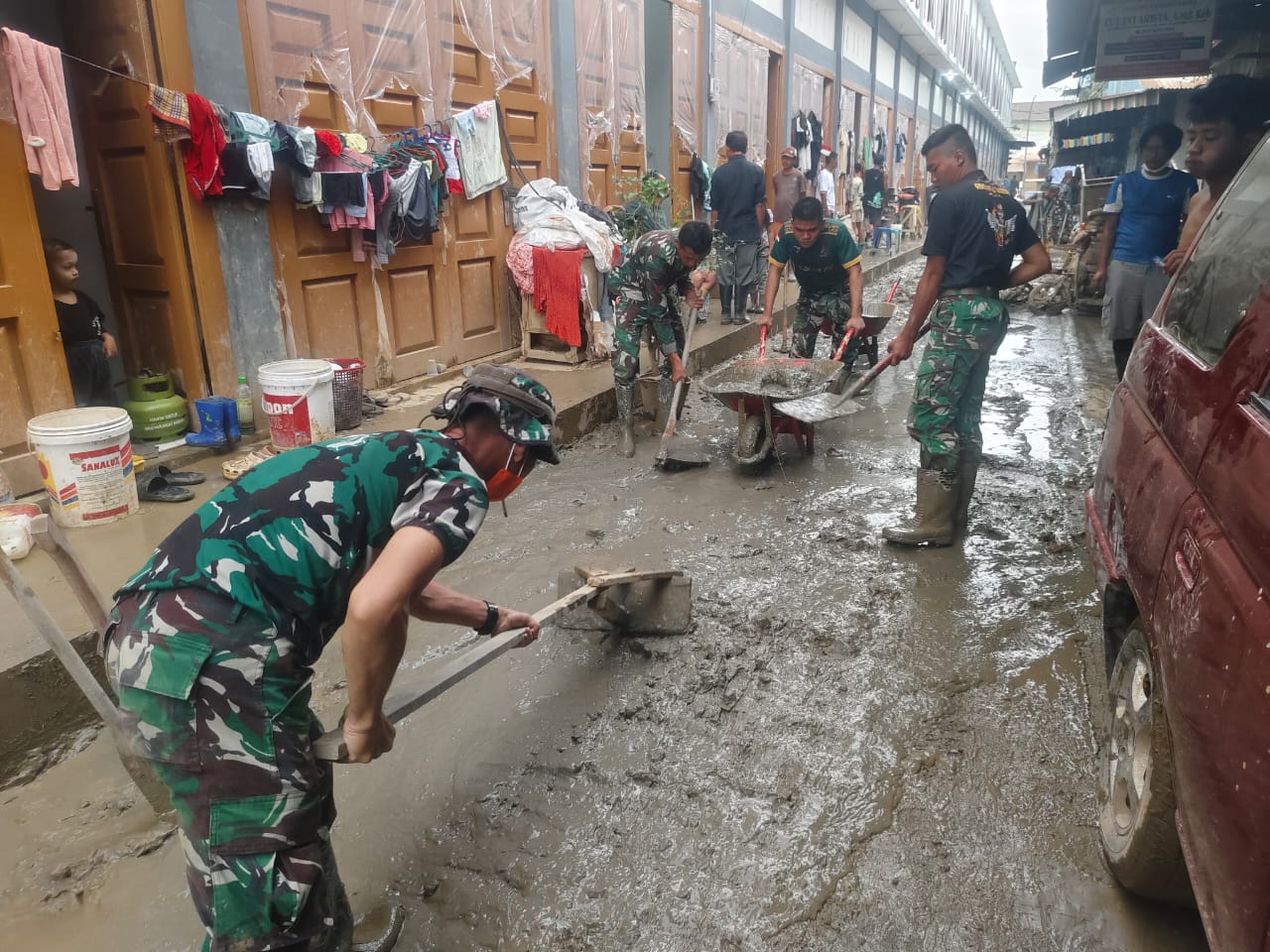 Dalam upaya pemulihan kehidupan masyarakat pasca banjir, personel Yonif 115 melakukan pembersihan area Pasar Kuala Simpang, Kabupaten Aceh Tamiang Sabtu, (27/12/2025).