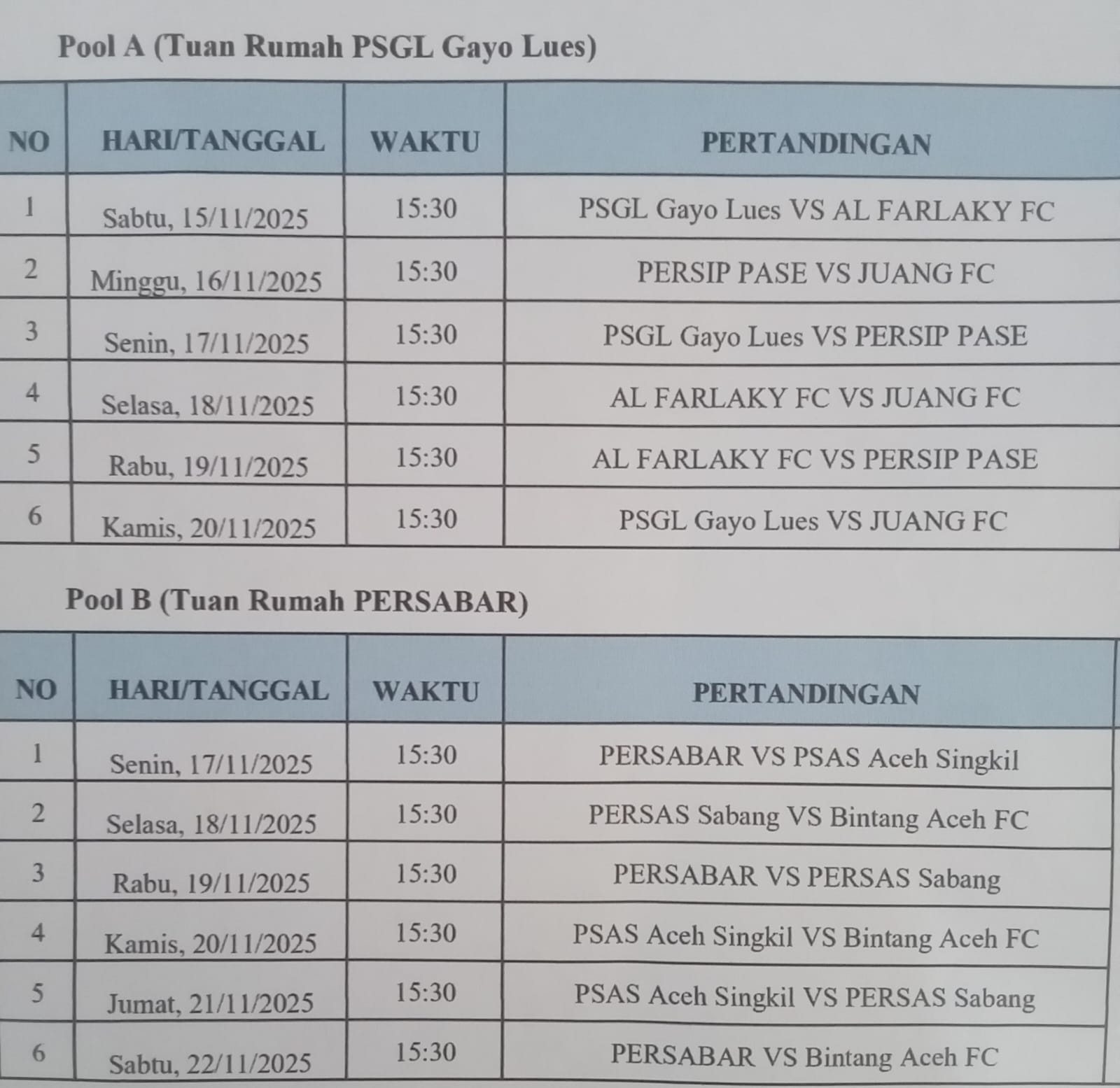 Pertandingan yang digelar Stadion Blang Paseh, Kota Sigli akan diramaikan oleh tim tangguh yang tergabung dalam Pool C yakni, Tuan rumah PSAP Sigli, PSST Simpang 3, Tamiang United, Putra Langsa dan bonden asal Pidie Persimura Beureunuen akan dihelat Selasa (18/11/2025) hingga Senin 24 November 2025.