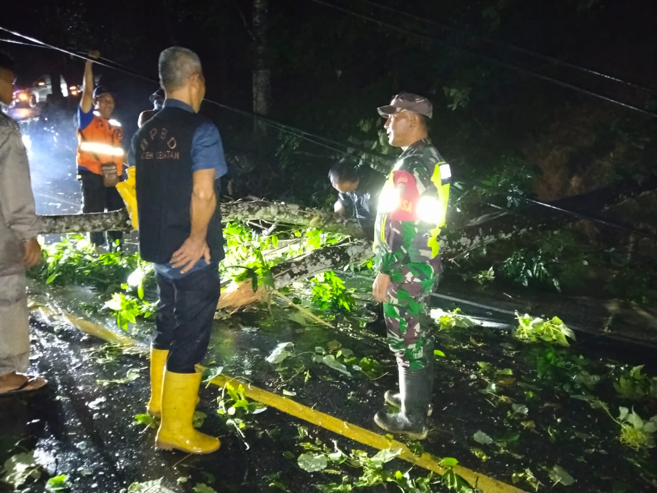 Mendapat laporan dari masyarakat, Kodim 0107/Aceh Selatan segera menurunkan personel anggota Koramil 04/Sawang bersama TNI, Polri, BPBD, PLN, Pemerintah Kecamatan, serta warga sekitar untuk melakukan pembersihan material secara gotong royong menggunakan peralatan manual dan mesin pemotong kayu.