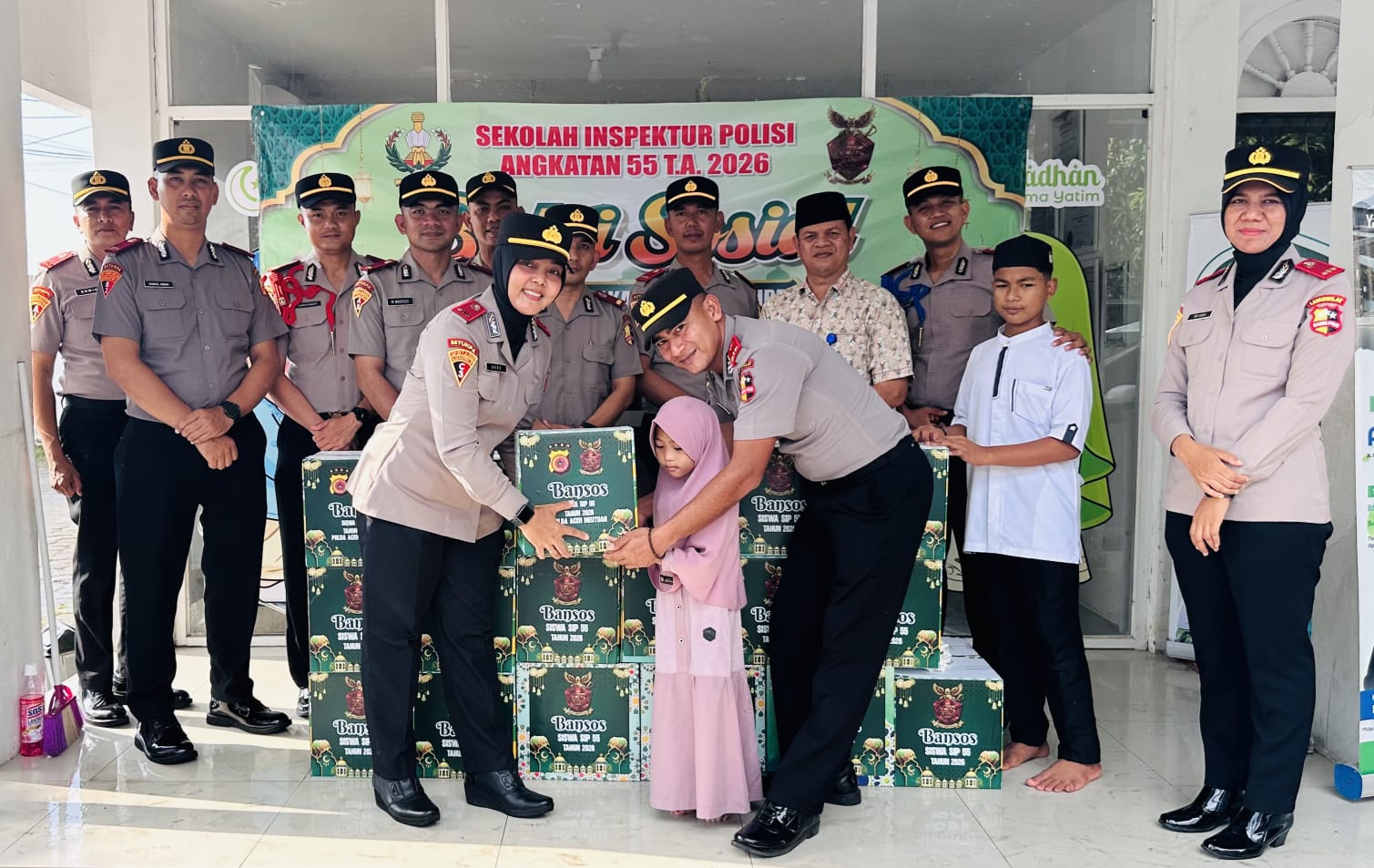 Dalam kegiatan tersebut, para siswa SIP Angkatan 55 menyerahkan bantuan sosial (Bansos) berupa paket sembako yang diperuntukkan bagi anak-anak yatim sebagai bentuk kepedulian dan empati terhadap sesama.