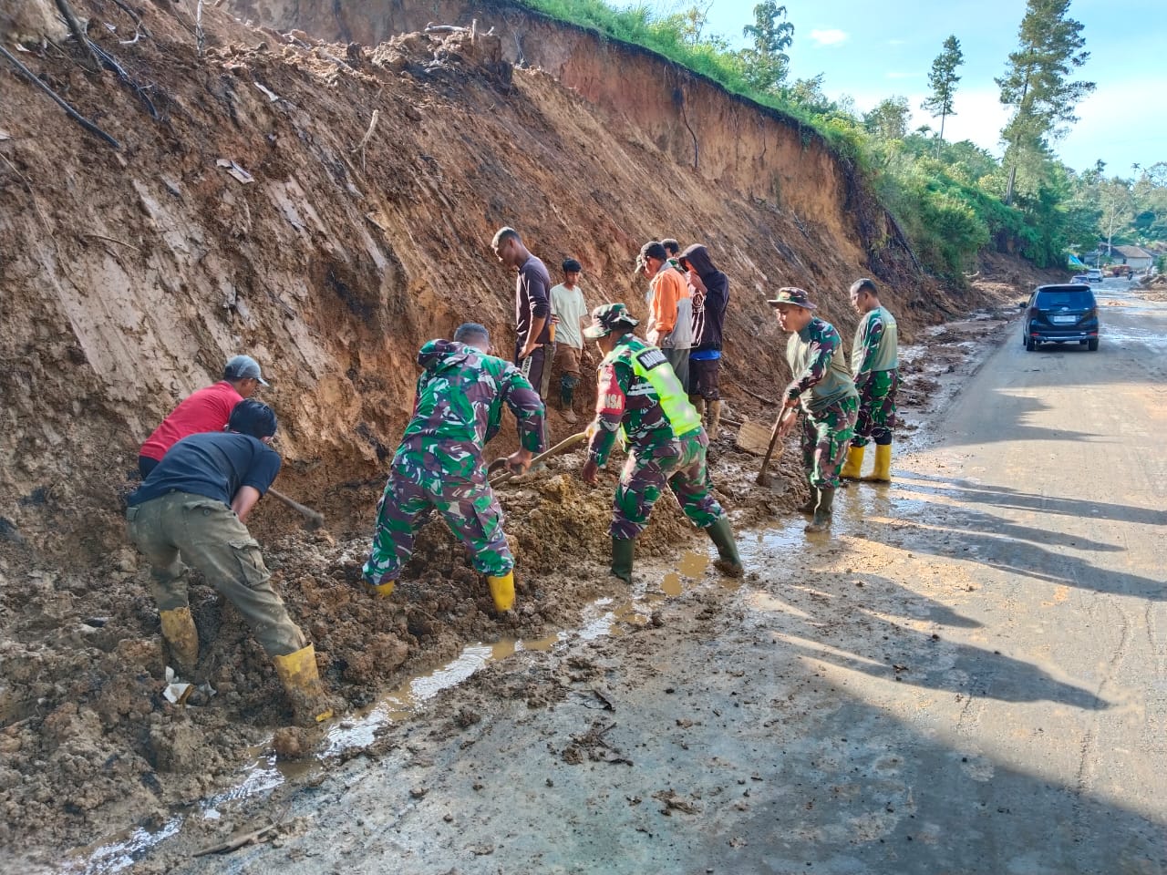 Dengan semangat kebersamaan, personel TNI dan warga bahu-membahu membersihkan material longsoran tanah yang menutup jalur pipa, memperbaiki bagian pipanisasi yang mengalami kerusakan, serta memastikan aliran air dapat kembali mengalir normal ke rumah-rumah warga.
