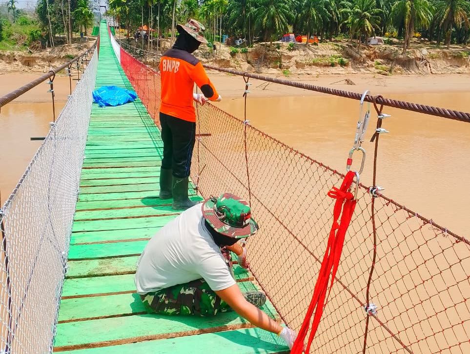 Pembangunan Jembatan Gantung yang dikerjakan personel Kodim 0117/Aceh Tamiang bersama Brigif 25/Siwah itu sebagai bentuk sinergi dan kolaborasi antar satuan TNI tersebut telah memasuki tahap akhir dan hampir selesai.